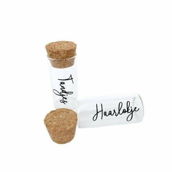 Deze glazen potjes hebben een opdruk met de tekst eerste tandjes & eerste haarlokje. De potjes sluit je doormiddel van een kurk dop en kan je weg bergen om later als herinnering aan je kleintje te geven.