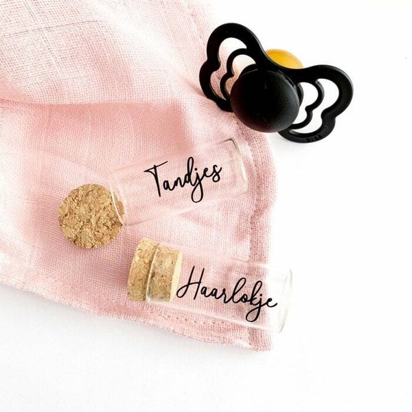 Inhoud: 2 glaasjes (tandjes en haarlokje)