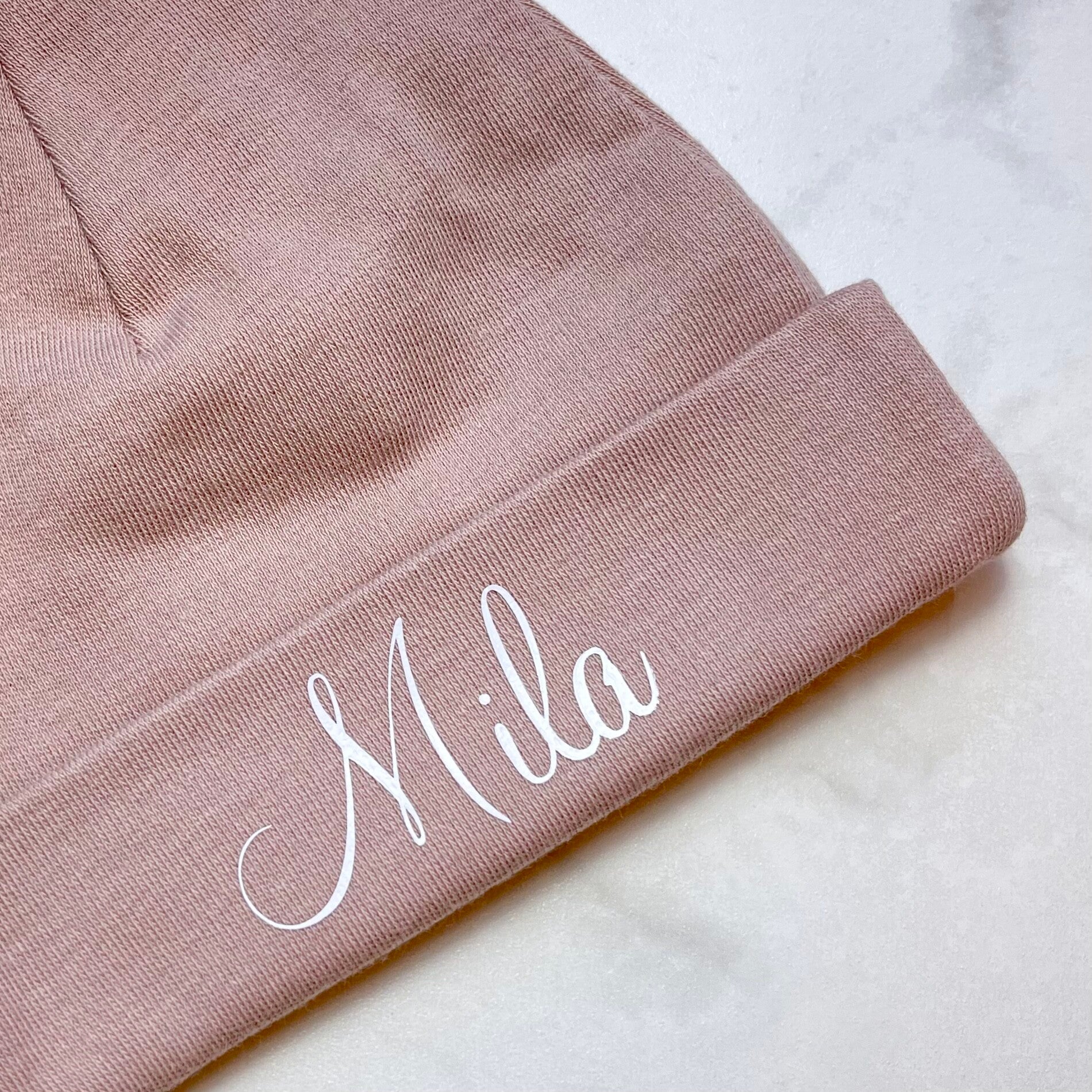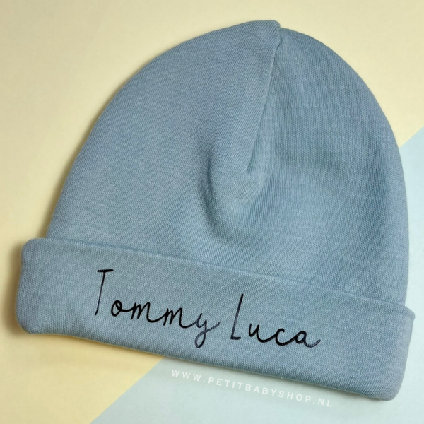Dit newborn babymutsje kun je laten personaliseren door het te laten bedrukken met naam. Perfect voor het aankondigen van jouw kleintje, leuk om cadeau te geven maar nog leuker om cadeau te krijgen.
