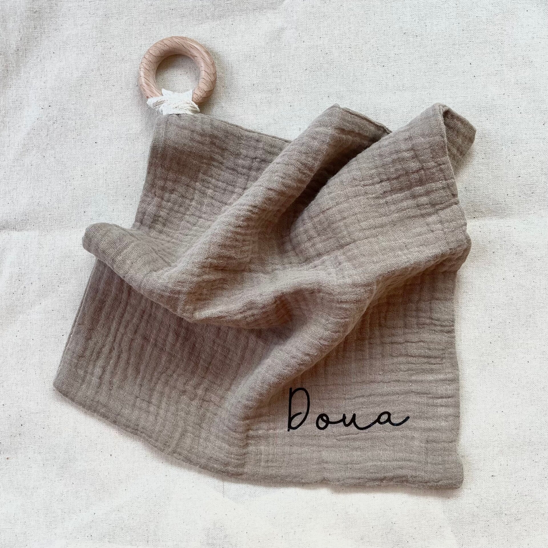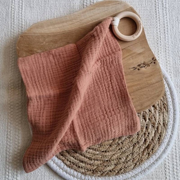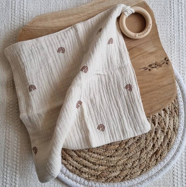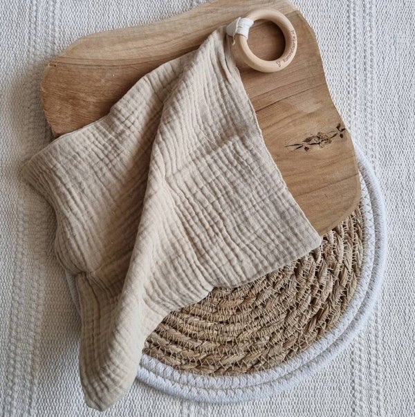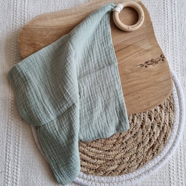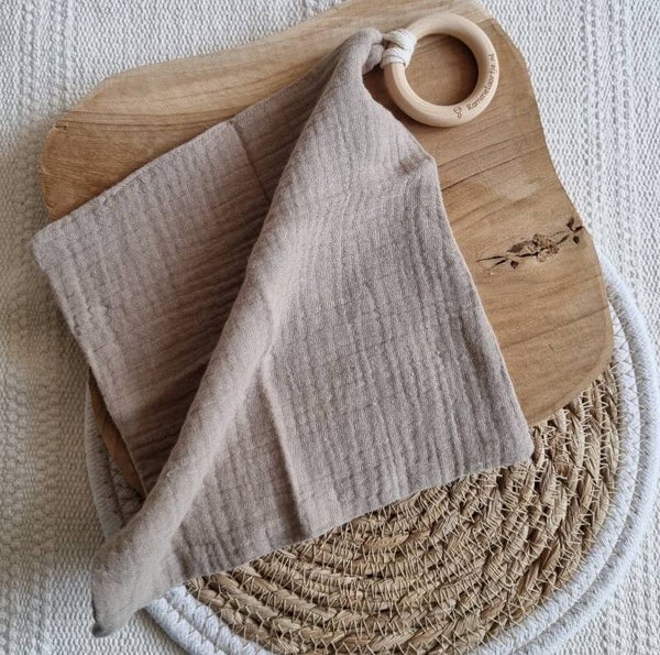 Zachte hydrofiele stof met een houten bijtring. Een fijn knuffeldoekje om mee te tutten in zachte en neutrale tinten! De houten bijtring is eenvoudig los te maken zodat het doekje gebruikt kan worden om aan een speentje te hangen.