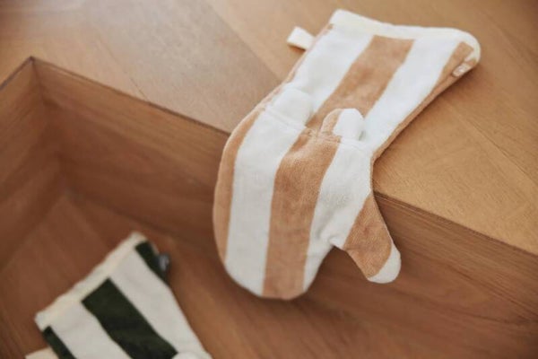 De gestreepte washand is verkrijgbaar in 2 kleuren: Biscuit en Leaf Green.