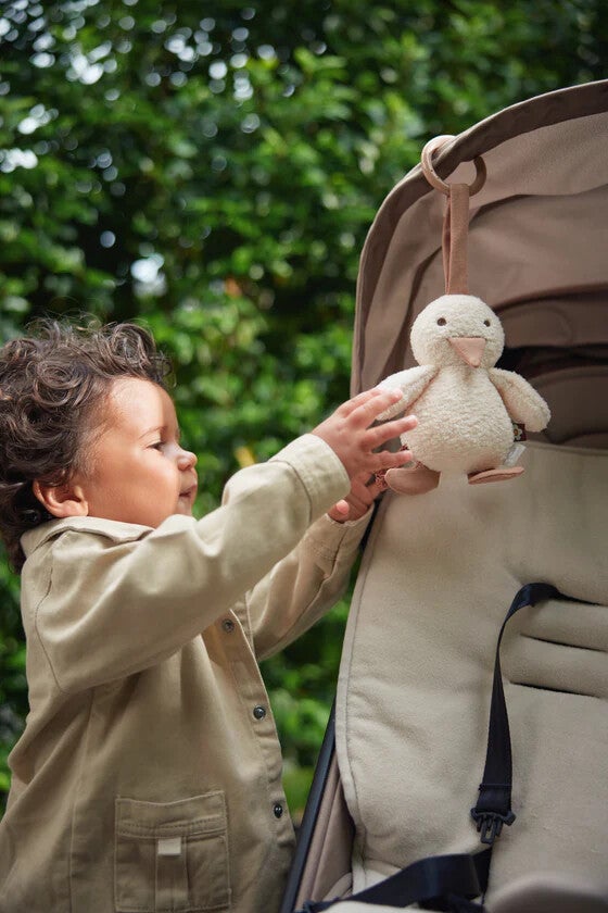 Hoe leuk is deze wagenhanger met schattig eendje! Naast dat dit ontzettend leuk staat, zal dit ook de motoriek van jouw kleintje stimuleren en de zintuigen prikkelen. Dit schattige eendje kun je met de plastic ring gemakkelijk aan de maxi cosi of wandel wagen bevestigen. De binnenkant bevat een belletje. Ook zit er een extra kleurrijke tag aan en twee korte koortjes. Het snaveltje en de voetjes van het eendje hebben een knisper geluidje. Daarnaast zit er op de buik van het eendje een baby spiegel. Dit lieve eendje zal zorgen voor vermaak van jouw kleintje! De wagenhanger is 18 cm. Ook verkrijgbaar in de vorm van een bloemetje.